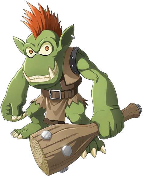 Goburimon (also known as Goblinmon) is a Child-level Virus Digimon. It appears as a goblin-like humanoid with a short body, green skin, pointed ears and fangs jutting upward from its lower jaw. It wears brown leather garments, has red hair on its head styled into a mohawk, and carries around a bulky, wooden club with nails and screws embedded in it.