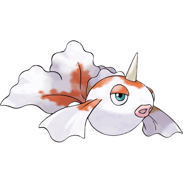 Known as the Goldfish Pokémon, Goldeen can be recognised by its unique coloration and wavy fins. Its body is mostly white, but sports orange markings over its back, pectoral fins and tail fins. It also has green eyes and sports a single horn on its head.
