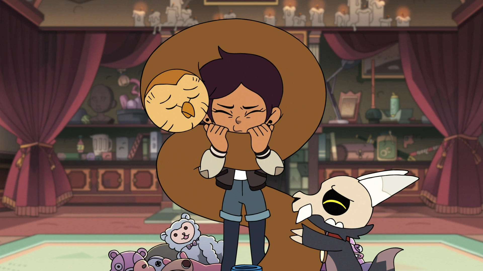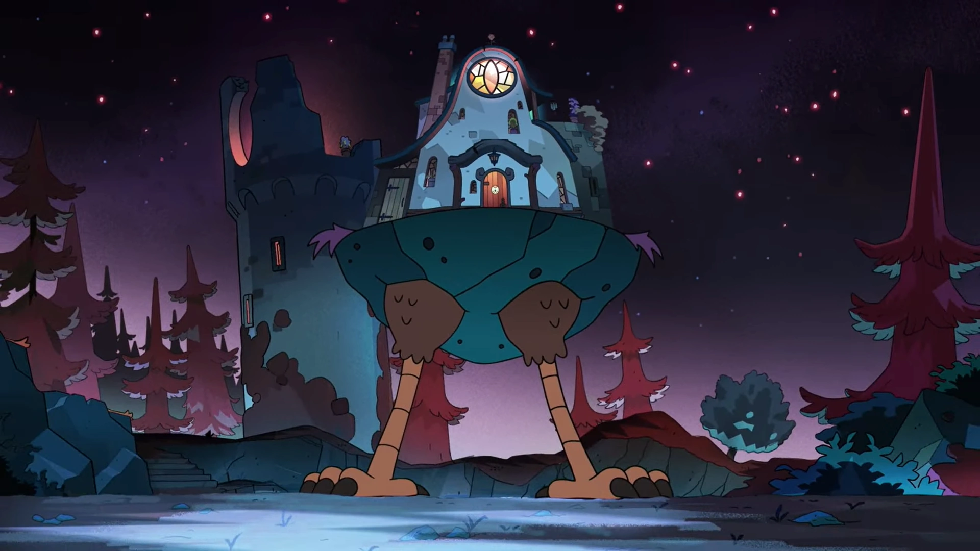 Following her first visit to Hexside, Luz invited her new friends, Willow Park and Gus Porter, to a sleepover at the Owl House. Together, they performed a Moonlight Conjuring to bring an object to life, but the effect of the spell was not what they had expected. None of the objects they had placed in the ritual circle were animated; instead the spell had affected the Owl House itself, with the kids having effectively possessed Hooty. With the house under their control, the kids took it on a joyride through Bonesborough. After the trio got captured by Animal Control, they were almost killed when they got thrown off a cliff. Luckily, the teenagers were able to get back up and get inside the house, then returning the house to its original location.