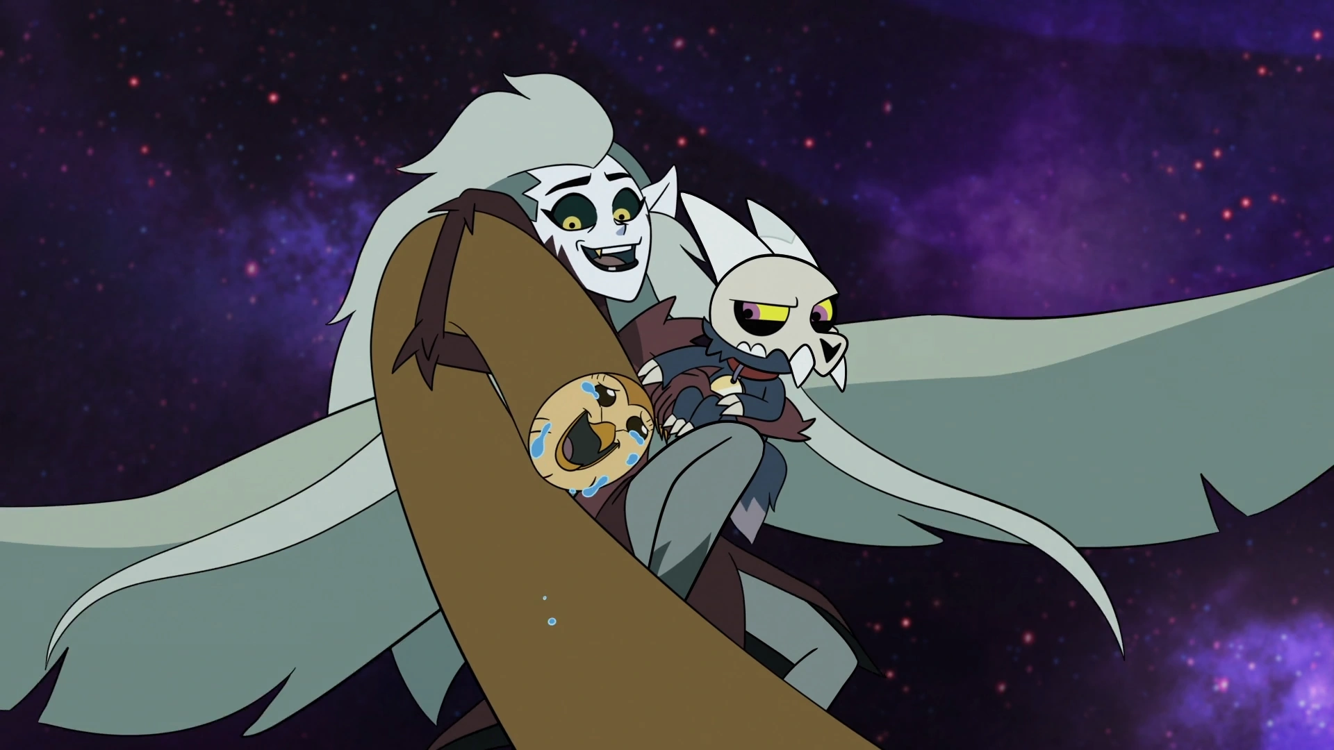Hooty then tried to make Eda get some sleep as she had been burning herself out trying to come up with a means to disrupt Emperor Belos' plans for the Day of Unity. He prepared some cookies for her, mixing in some sleeping nettles. When Eda ate one of the cookies, she immediately fell asleep and experienced a lucid dream in which she confronted the spirit of the Owl Beast, eventually making peace with it. When Eda awoke, she found that she had assumed a new harpy-like form. She had control of herself in this state, but upon seeing her, Hooty assumed he had messed up and dashed away sobbing.