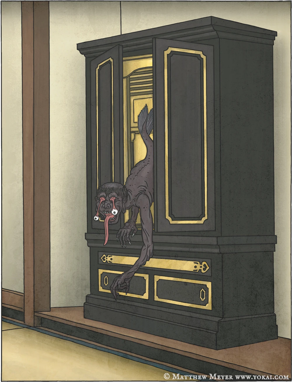 In Japanese tradition, a butsudan is a family shrine and is left open during the day but is expected to be closed at night in case spirits from the other world use it to enter our own. The nuribotoke is one such creature.