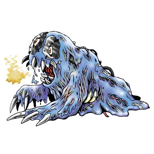 Raremon is an Adult-level Virus Digimon of the Undead class. Due to data corruption during digivolution, this Digimon has assumed a grotesque, horrifying form. Its once-cohesive body has rotted into a heap of molten flesh. It has managed to keep itself alive by haphazardly adding mechanical components, but it is no longer capable of higher thinking and acts purely on instinct. It is slow and has limited attack power, but its decaying body constantly gives off a foul stench that will send lower-level Digimon running for the hills.