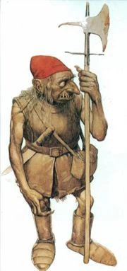 Diminutive, stocky humanoids possessed of incredible strength and durability, Redcaps have sharp teeth and claws, long, lank hair, and glowing red eyes. They carry a tall pikestaff with them wherever they go, and sport a pair of heavy iron boots. Redcaps take their name from the crimson bonnets they like to wear.