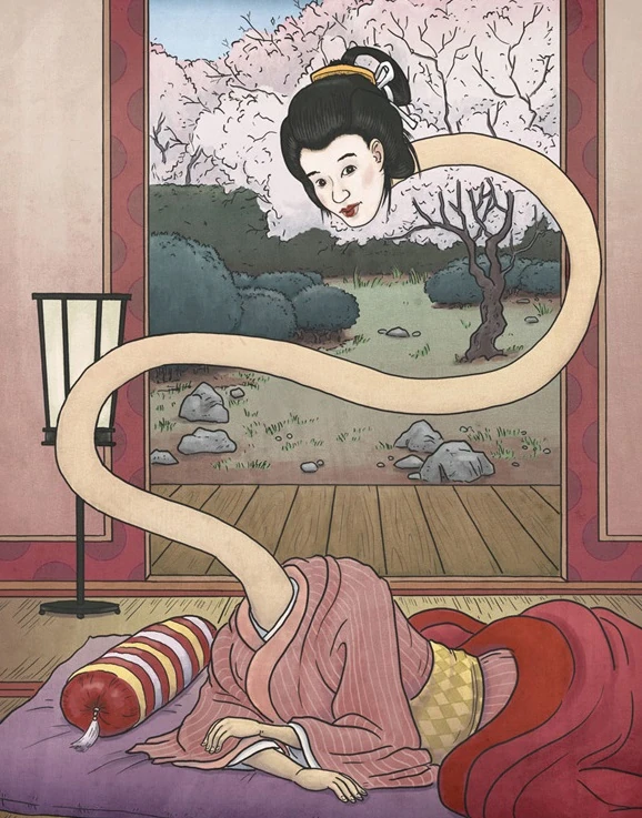 Rokurokubi is a yokai found in Japanese folklore. During the day they appear to be normal human beings, but at night they gain the ability to stretch their necks to great lengths like a snake.