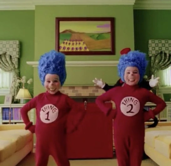 Thing One and Thing Two are the minor protagonists of the Dr. Seuss's tale titled The Cat in The Hat. They are the Cat in The Hat's helpers.