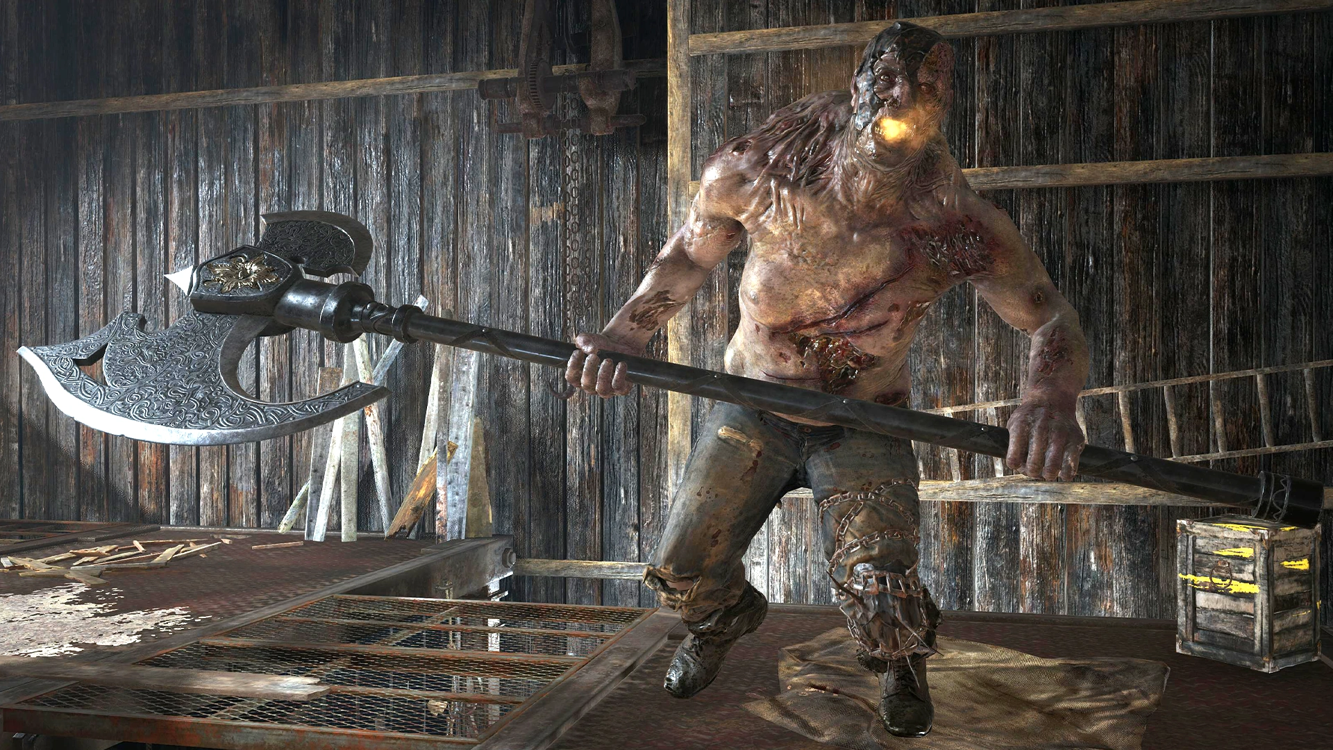 The Uriaș Drac (Romanian for "Devil Giant") is a variant of the Uriaș in Resident Evil Village. While slightly shorter than the original, the Drac variant is just as strong and aggressive. It lacks the lupine mutations seen in the standard Uriaș or Uriaș Străjer, but its body is covered with scars and it carries a giant two-handed axe.