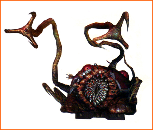 Birkin's third form seems to have gained a semblance of stability, though it now has two disproportionately large arms ending in razor-sharp talons extending from its back. The back arms are actually his original arms, the semi-human arms on either side of his torso being new limbs grown by the virus. The eye on his shoulder appears to have shrunk somewhat and another eye has appeared on his left hip. Birkin's face has completely disappeared and the new head appears to have an exterior skull. What appears to be some kind of maw is forming on his chest, the multiple boney spikes actually being fangs.